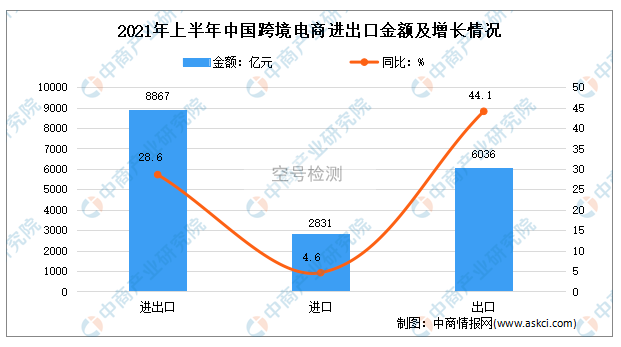 数据显示,2021年上半年我国跨境电商进出口8867亿元,同比增长28.6%。其中,出口6036亿元,增长44.1%;进口2831亿元。